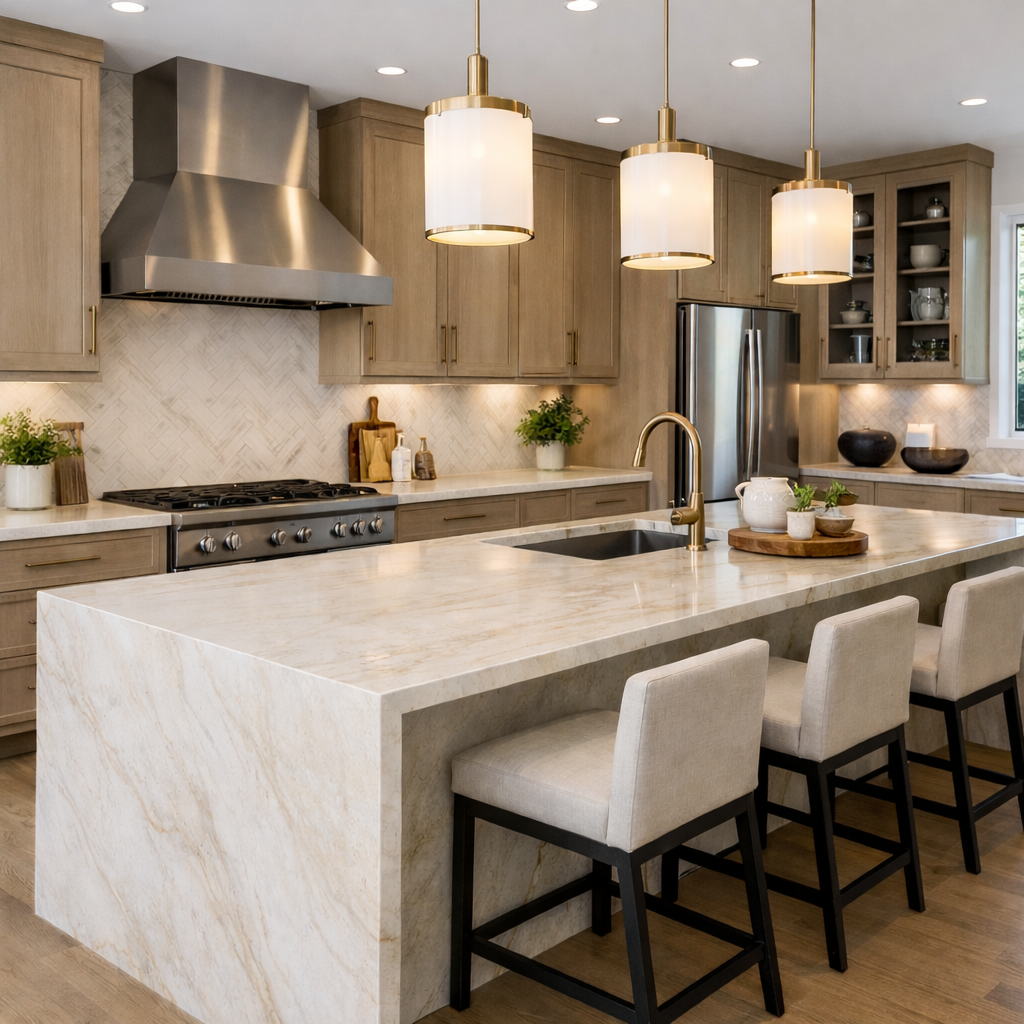 Taj Mahal Quartzite features a soft white background with elegant gold veining. Stronger than granite and visually similar to marble, this natural stone brings both beauty and durability to countertops, waterfall islands, flooring, and accent walls.